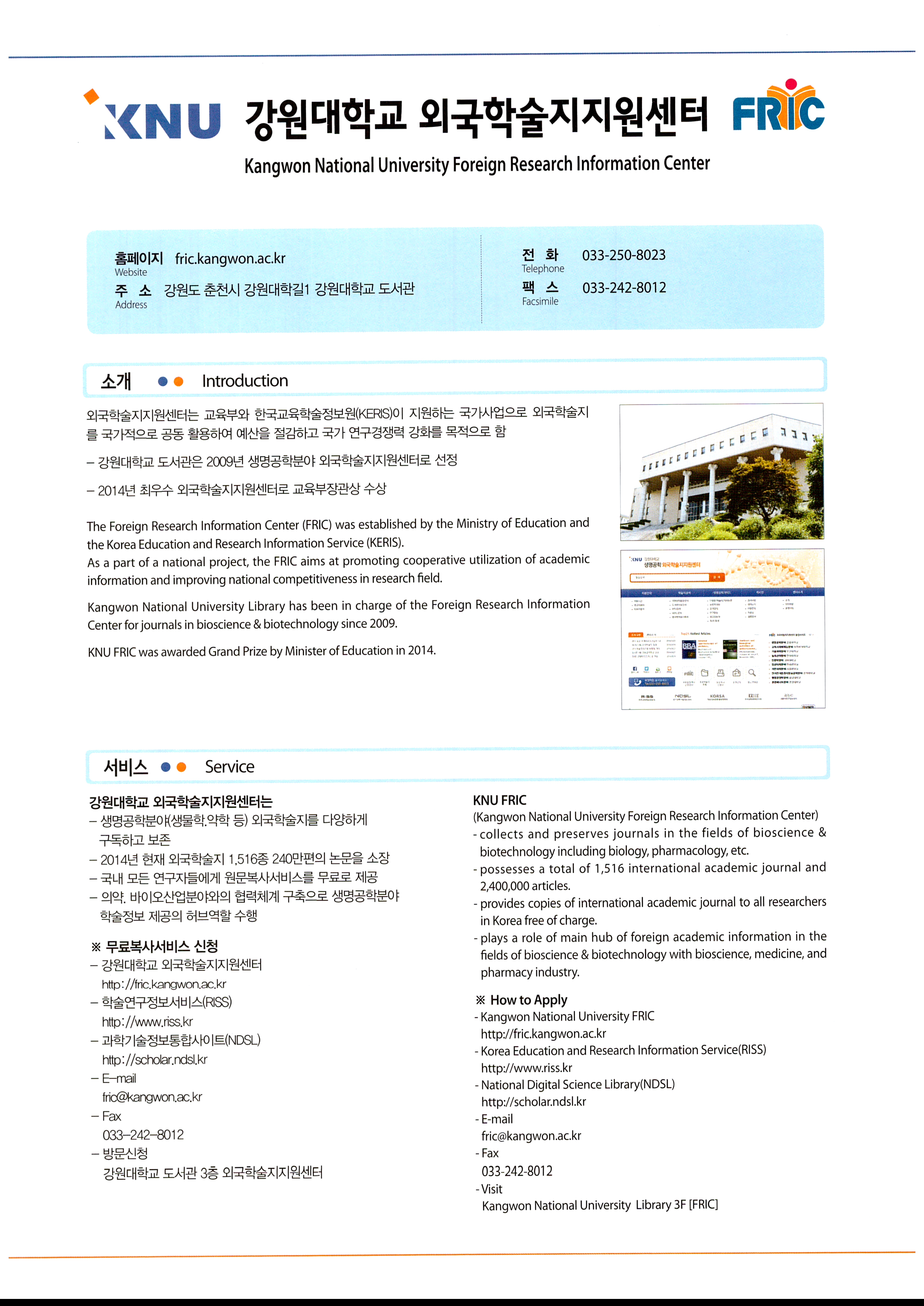 강원대학교 외국학술지지원센터는 2009뇬 생명공학분야(생물학, 약학, 기초의학 등) 외국학술지지원센터로 선정되어