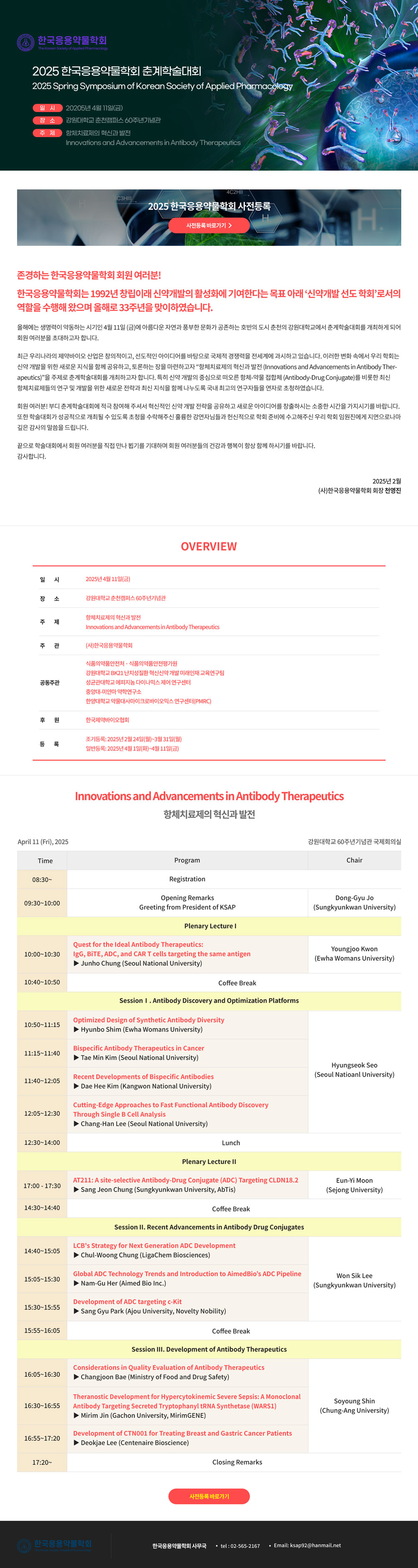 다가오는 4월 11일(금), 강원대학교(춘천) 60주년기념관에서 '항체치료제의 혁신과 발전(Innovations and Advancements in Antibody Therapeutics)'라는 주제로 ‘2025 춘계학술대회’를 개최합니다.